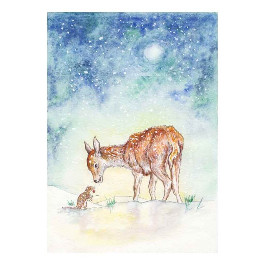 Mouse and Fawn Christmas, is a yearly illustration from artist Annie Daltons Art - painted in 2022 and part of a continued festive series.
